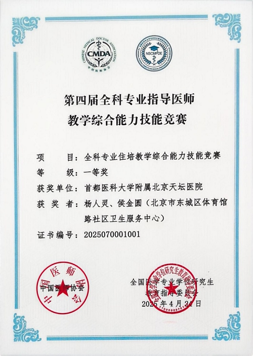 2025年4月24日从第四届全科专业指导医师教学综合能力竞赛现场传来捷报!在湖南长沙举办的这场全国性赛事中,北京天坛医院全科医学科杨人灵医师与北京市东城区体育馆路社区卫生服务中心侯金圆医师凭借扎实的专业功底与出色的教学能力,一路过关斩将,最终斩获综合排名第一的好成绩,荣获比赛一等奖!